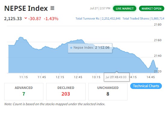 मौद्रिक नीति सन्तोषजनक नहुँदा नेप्सेमा गिरावट आएको लगानीकर्ताहरुको भनाई छ । बिहीवार नेप्से सूचकांक २९।७१ अंकले घटेर २,१२६ को विन्दुमा कायम हुन पुगेको छ ।