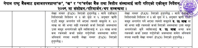 शेयर धितो कर्जा, रियल स्टेट कर्जा तथा हायर पर्चेज कर्जाका विद्यमान जोखिम भारसम्बन्धी व्यवस्था पुनरावलोकन गरेको जारी निर्देशिकामा उल्लेख गरेको छ ।