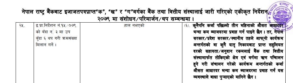 कुनै पनि कर्जा पछिल्लो तीन महिनाको औसत आधारदर भन्दा कम ब्याजदरमा प्रवाह गर्न नपाइने व्यवस्था एकीकृत निर्देशिका मार्फत ल्याएको छ। एकीकृत निर्देशिकामा नेपाल सरकार, प्रदेश सरकार, स्थानीय तहले आफनो कार्यक्रम अन्तर्गतको वा कुनै दातृ निकायबाट प्राप्त सहुलीयत दरको सहायता एवं अनुदान रकमलाई बैंक तथा वित्तिय संस्थामार्फत तोकिएको क्षेत्र एवं वर्गमा ऋण परिचालन हुने गरी संचालन गरेको कार्यक्रम अन्तर्गको कर्जा औषत आधारदर भन्दा कम ब्याजदरमा प्रवाह गर्न यस व्यवस्थाले नरोक्ने जनाएको छ।