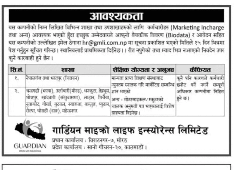 गार्डियन माइक्रो लाइफ इन्स्योरेन्सले खुलायो रोजगारको अवसर, के–के चाहिन्छ योग्यता ?