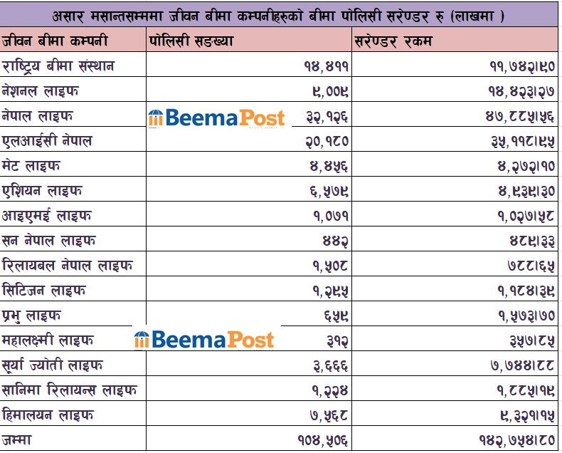 जीवन बीमा कम्पनीहरुमा १४ अर्ब रुपैयाँ बीमा पोलिसी सरेण्डर, कुनको कति ?(सूची सहित)