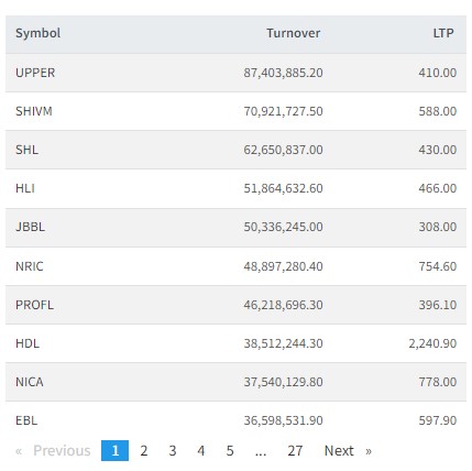 त्यस्तै, शिवम् सिमेन्टस, सोल्टि होटल, हिमालयन लाइफ, ज्योती विकास बैंक, नेपाल पुनर्बीमा, प्रोगेशीभ फाइनान्स, हिमालयन डिष्टलरी, एनआईसी एशिया बैंक र एभरेष्ट बैंकको शेयर सर्वाधिक खरिदबिक्रिको लिष्टमा परेको छ।