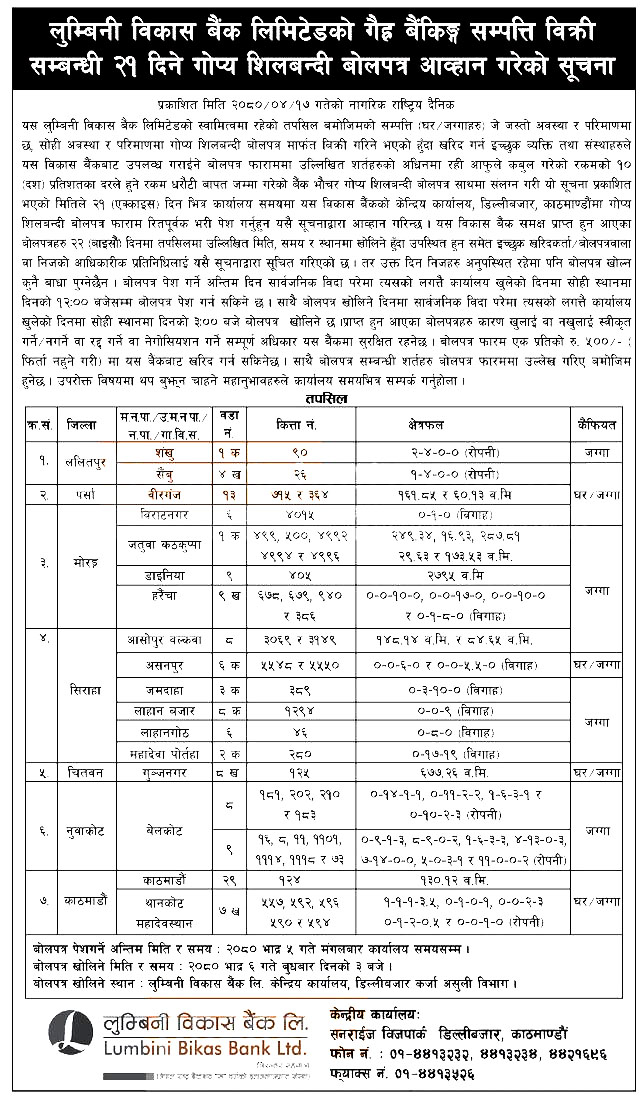 काठमाडौं । लुम्बिनी विकास बैंकले आफ्नो स्वामित्वमा रहेको उल्लेखित सम्पत्ति, घर जग्गाहरु बिक्रीका लागि गोप्य शिलबन्दी बोलपत्र आह्वान गरेको छ । उल्लेखित गैह्र बैंकिङ सम्पत्ति जँहा जे जस्तो अवस्थामा छ सोही अवस्था र परिमाणमा बिक्री गरिने बैंकले जनाएको छ ।
