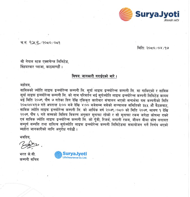 आज बसेको बैठकले साबिक ज्योति लाइफको पुँजी, रिजर्भ, लगानी रकम, जीवन बीमा कोषलगायत सम्पूर्ण सम्पत्ति तथा दायित्व सूर्यज्योति लाइफमा समायोजन गर्ने निर्णय पनि गरेको छ।साबिक ज्योति लाइफ सूर्य लाइफसँग मर्जर गरी हाल एकिकृत कारोबार गरिरहेका छन् ।