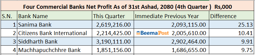 वित्तीय विवरण सार्वजनिक गर्ने वाणिज्य बैंकहरुमा सिटिजन्स बैंक, माछापुच्छे«, सिद्धार्थ बैंक र सानिमा बैंक रहेका छन् । बैंकहरु मध्थे सानिमा बैंकको खुद नाफा सबैभन्दा बढी प्रतिशतले बढेको छ ।