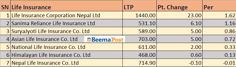 बिहीबार जीवन बीमा सेक्टरबाट कुल ७ जीवन बीमा कम्पनी कारोबारमा आएका छन् । जसमध्ये नेपाल लाइफ इन्स्योरेन्सको शेयरमूल्य ०.०१ प्रतिशतले घटेको छ भने अन्य सबैको शेयरमूल्यमा हरियाली छाएको छ । लाइफ नेपाल इन्स्योरेन्सको शेयरमूल्य सर्वाधिक १.६२ प्रतिशतले बढेको छ ।