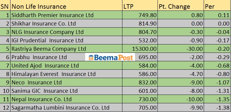 कारोबारको अन्तिम दिन निर्जीवन बीमा सेक्टरबाट कुल १२ कम्पनी कारोबारमा आएका थिए । जसमध्ये अधिकांशको शेयरमूल्यमा गिरावट आएको छ । बिहीबार सिद्धार्थ प्रिमियरको शेयरमूल्यमा ०.११ प्रतिशतको वृद्धि आएको छ । यसबाहेकका अन्य कुनै पनि निर्जीवन बीमा कम्पनीको शेयरमूल्यमा वृद्धि आएको छैन । सिद्धार्थ प्रिमियर इन्स्योरेन्सको शेयरमूल्य सर्वाधिक ०.११ प्रतिशतले बढेको छ ।