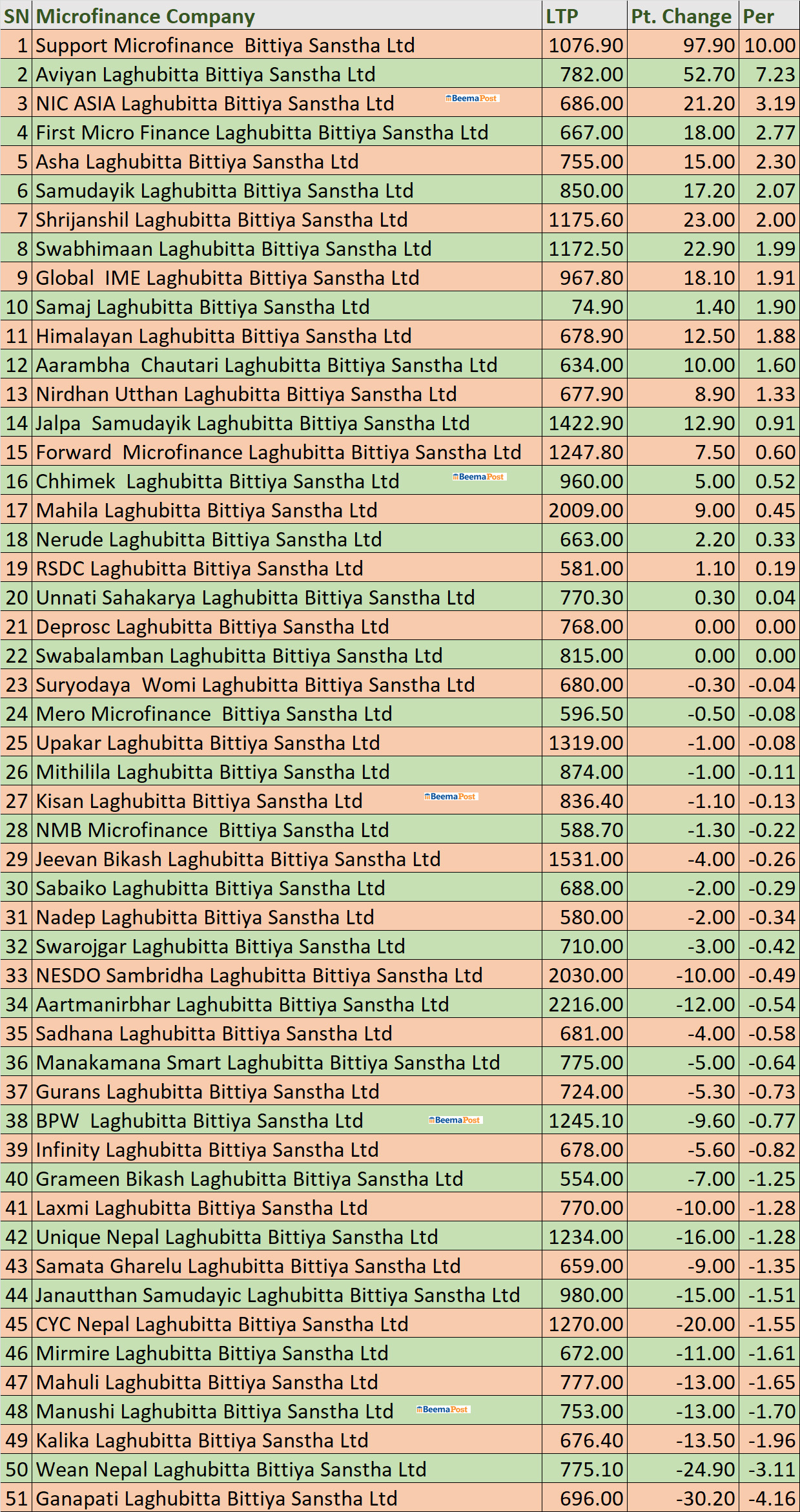 कारोबारको अन्तिम दिन माइक्रोफाइनान्स सेक्टरबाट कुल ५१ कम्पनी कारोबारमा आएका छन् । जसमध्ये २० माइक्रोफाइनान्स कम्पनीको शेयरमूल्यमा वृद्धि आएको छ ।