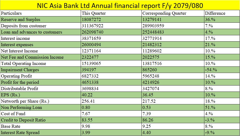 एनआईसी एसियाले समीक्षा अवधीमा कूल ३८ अर्ब ब्याज असुल गरी २६ अर्ब रुपैयाँ निक्षेपकर्तालाई ब्याज वितरण गरेको छ । त्यस्तै, बैंकको डिपोजिट ७ प्रतिशतले बृद्धि हुँदा कर्जा जम्मा ४ प्रतिशतले बृद्धि भएको छ । बैंकले ब्याज आम्दानी १७ प्रतिशतले बृद्धि हुँदा ब्याज खर्चमा २१ प्रतिशतले बृद्धि भएको देखिएको छ । त्यस्तै, बैंकले फि र कमिशनमा १५ प्रतिशतले बृद्धि भएको देखिएको छ । बैंकले फि र कमिशन बापत दुई अर्ब ३२ करोड २४ लाख ७७ हजार रुपैयाँ आम्दानी गरेको छ ।