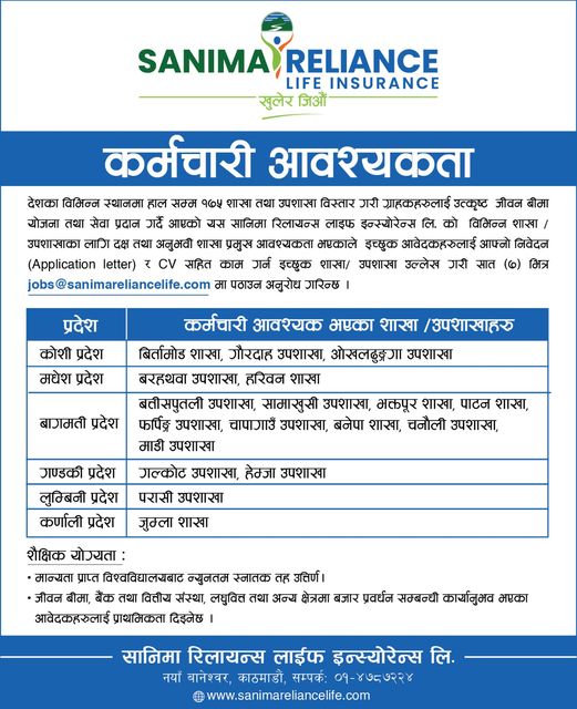 काठमाडौं । सानिमा रिलायन्स लाइफ इन्स्योरेन्सले विभिन्न शाखा तथा उपशाखाका लागि दक्ष तथा अनुभवि शाखा प्रमुखको माग गरेको हो ।