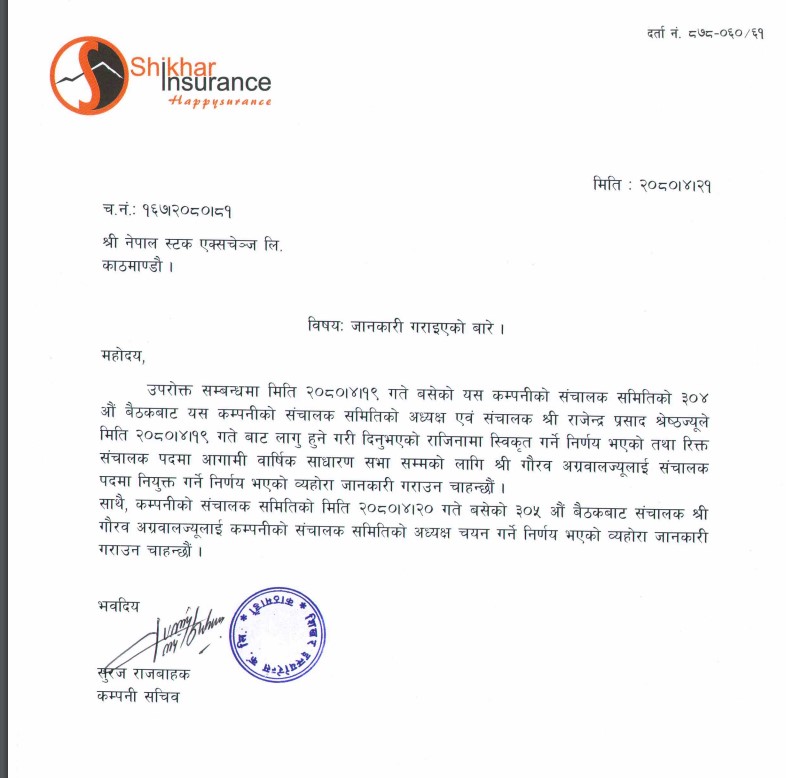 कम्पनीका यस अघिका अध्यक्ष राजेन्द्र प्रसाद श्रेष्ठले राजिनामा दिईसकेका छन् ।