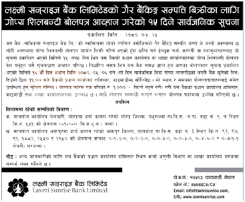 काठमाडौं । लक्ष्मी सनराइज बैंक लिमिटेडले भक्तपुर तथा मोरङमा अवस्थित गैर बैंकिङ सम्पत्ति गोप्य शिलबन्दी बोलपत्र मार्फत बिक्री गर्ने भएको छ ।