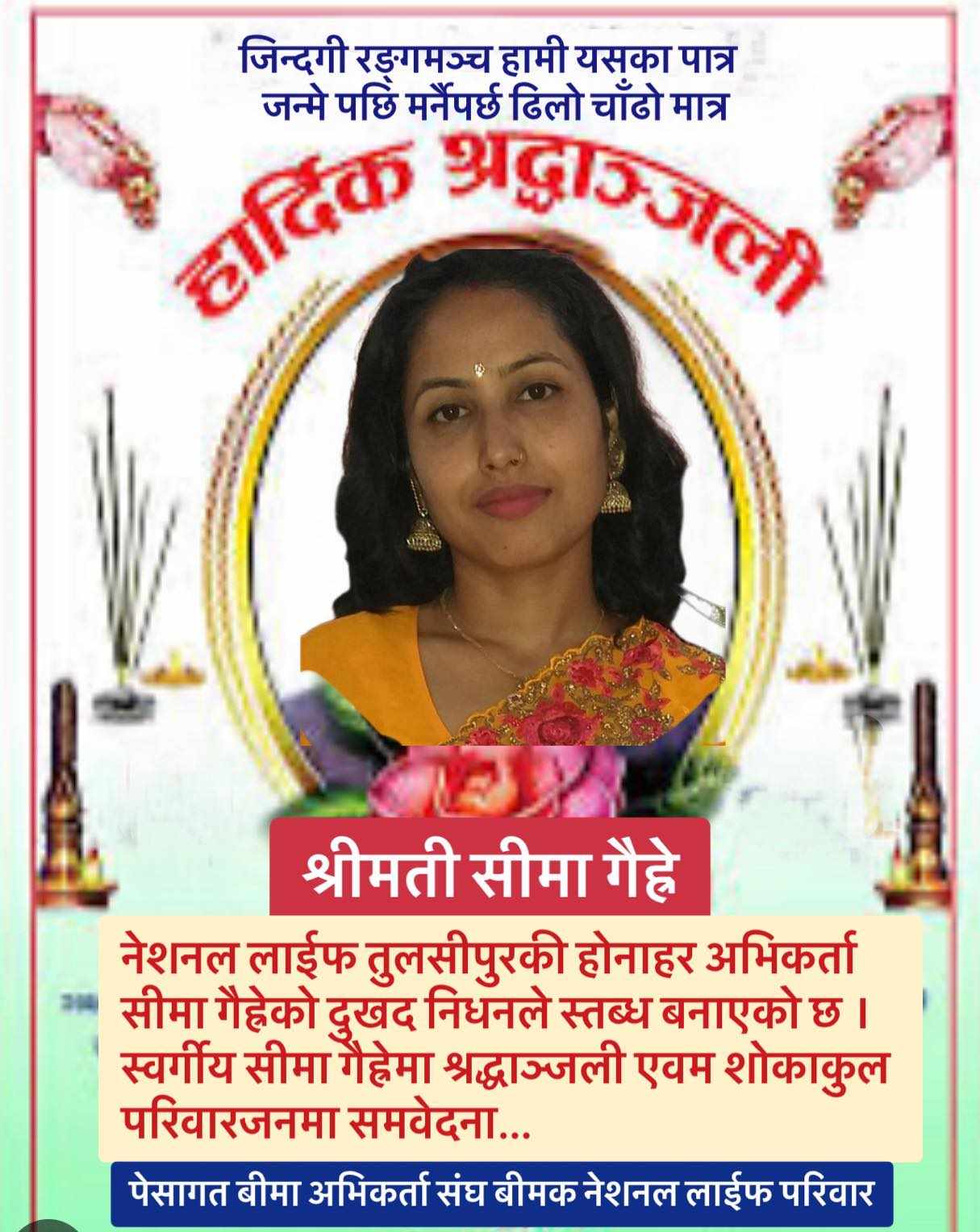 काठमाडौं । नेशनल लाइफ इन्स्योरेन्स कम्पनीको तुलसीपुर दाङ शाखाकी एजेन्सी म्यानेनजर सीमा गैह्रे बुढाथोकीको निधन भएको छ।