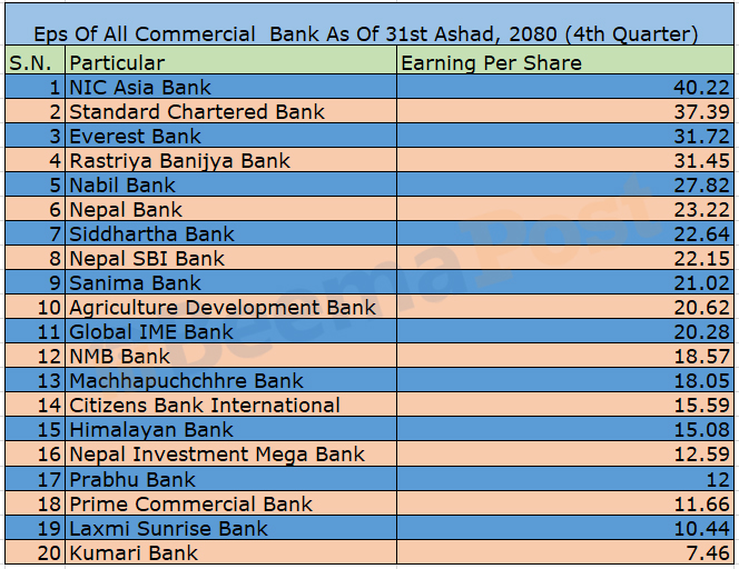प्रतिशेयर आम्दानीमा एनआईसी एशिया, स्टाण्डर्ड चार्टर्ड , एभरेष्ट बैंक सबैभन्दा अगाडी, अन्य कुनको कति ? (सूचीसहित)