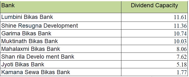 तेस्रोमा गरिमा विकास बैंक रहेको छ। बैंकको लाभांश क्षमता १०.७४ प्रतिशत रहेको छ। मुक्तिनाथ विकास बैंकको लाभांश क्षमता १०.०३ प्रतिशत रहेको छ ।