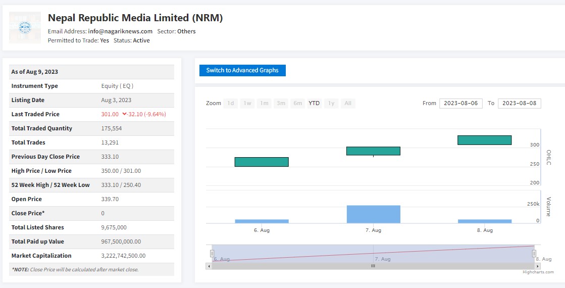 त्यस्तै, नेपाल रिपब्लिक मिडियाको शेयर हिजोको तुलनामा ३२ रपैयाँले घटेर ३ सय १ रुपैयाँमा कारोबार हुँदेछ ।कम्पनीको शेयर अधिकतममा ३ सय ५० देखि न्यूनतम ३ सय १ रुपैयाँसम्म कारोबार भएको देखिएको छ।यी दुई कम्पनीबीच सर्वाधिक खरिदबिक्रि हुनुमा एकलाई भने शंकाको बिषयमा हेरीएको छ ।
