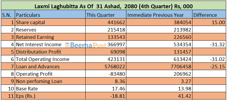 लक्ष्मी लघुवित्त वित्तीय संस्थाले ८ करोड ३० लाख रुपैयाँ घाटा व्यहोरेको छ । संस्थाले आज प्रकाशित गरेको गत आर्थिक वर्षको चौथो त्रैमाससम्मको अपरिष्कृत वित्तीय विवरणले यस्तो देखाएको हो । अघिल्लो वर्ष यही अवधिसम्म संस्थाले १५ करोड ९० लाख रुपैयाँ नाफा आर्जन गरेको थियो ।