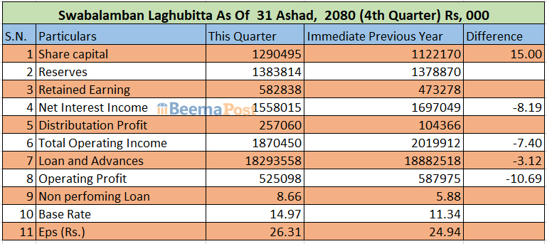 वित्तीय विवरण प्रकाशित गरेका लघुवित्त कम्पनीहरुमध्ये स्वावलम्बन लघुवित्तले सबैभन्दा बढी मुनाफा आर्जन गरेको छ । त्यस्तै, सपोर्ट लघुवित्त पनि अधिकांश वित्तीय सूचकमा अब्बल देखिएको छ ।