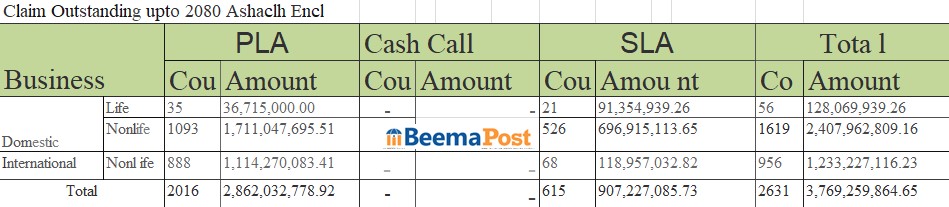 त्यस्तै, पुनर्बीमा कम्पनीले ३ अर्ब ७६ करोड ९२ लाख रुपैयाँ अर्थात कुल दाबी मध्ये ६९.४४ प्रतिशत भुक्तानी गर्न बाँकी रहेको जनाएको छ ।कम्पनीले जीवन बीमा तर्फ १२ करोड ८० लाख रुपैयाँ र निर्जीवन बीमा तर्फ ३ अर्ब ६४ करोड रुपैयाँ भुक्तानी गर्न बाँकी रहेको जनाएको छ ।