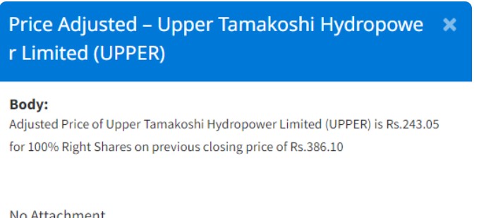 अपर तामाकोशी हाइड्रोपावरको शतप्रतिशत हकप्रद सेयरमा मूल्य समायोजन, आइतबार कतिमा खुल्छ ?
