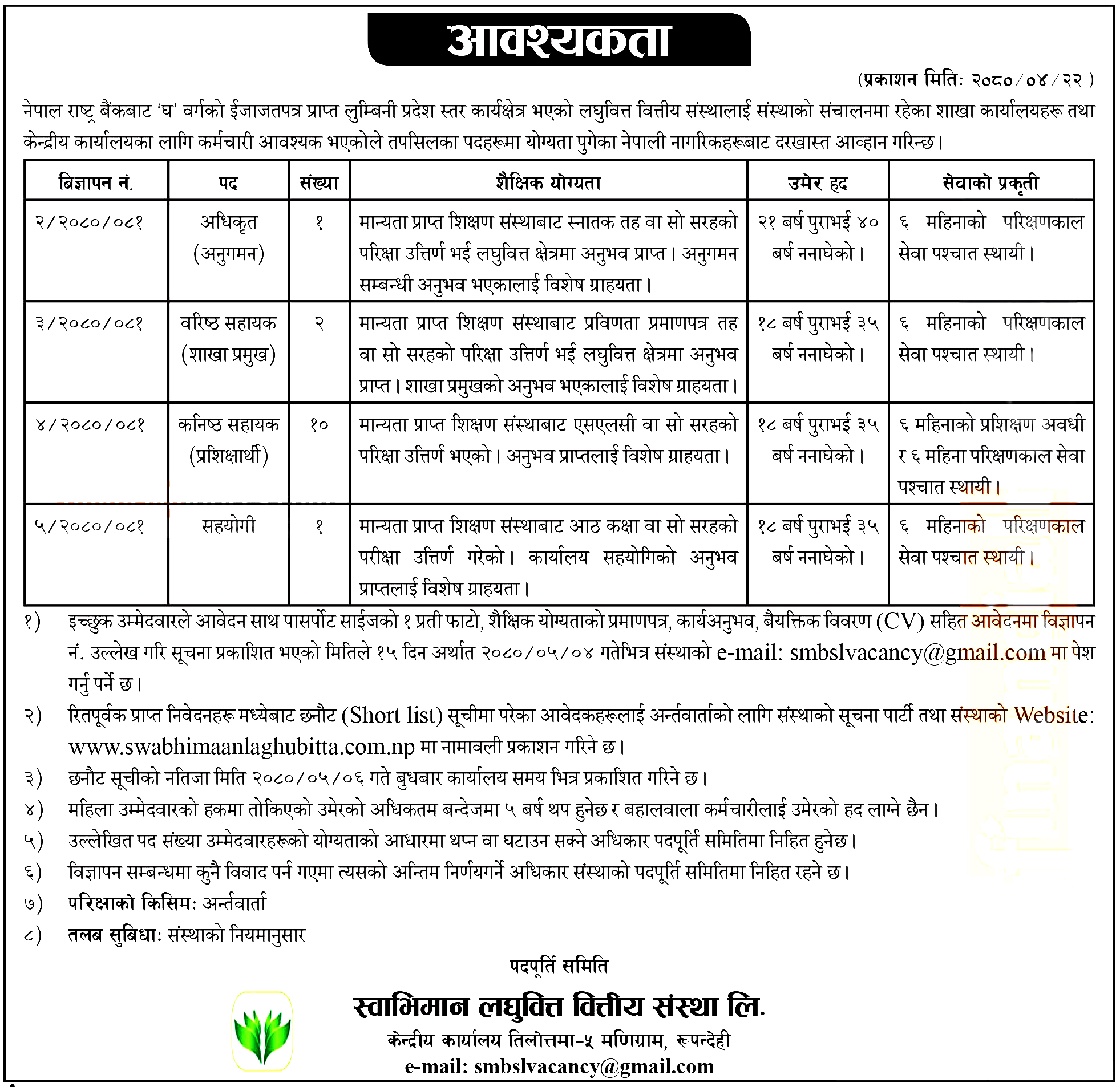 उक्त पदहरुमा आवेदन दिन इच्छुक उम्मेदबारहरुले संस्थाको आधिकारिक इमेल मार्फपत आवेदन दिन सक्ने संस्थाले जनाएको छ ।