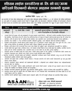 कम्पनीको उल्लेखित शर्तहरुको अधिनमा रही घरजग्गा बिक्री गर्न इच्छुक जो–कोहीले गोप्य शिलबन्दी बोलपत्रसहित को बिक्री प्रस्ताव कम्पनीको प्रधान कार्यालय एशियन लाइफ भवन, मैतीदेवी, काठमाडौंमा पेश गर्न कम्पनीले आग्रह गरेको छ ।