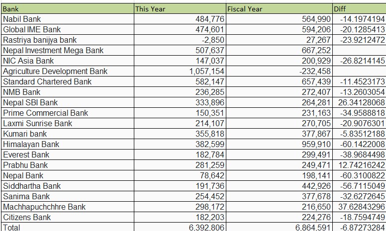 गत आर्थिक बर्षको असार मसान्तमा बैंकहरुले ६ अर्ब ८६ करोड ४५ लाख ९१ हजार रुपैयाँ आम्दानी गरेका थिए । चालु आवको सोही अवधिमा अघिल्लो आवको तुलनामा ६।८७ प्रतिशतले घटेर ६ अर्ब ३९ करोड २८ लाख ६ हजार रुपैयाँमा कायम भएको छ।