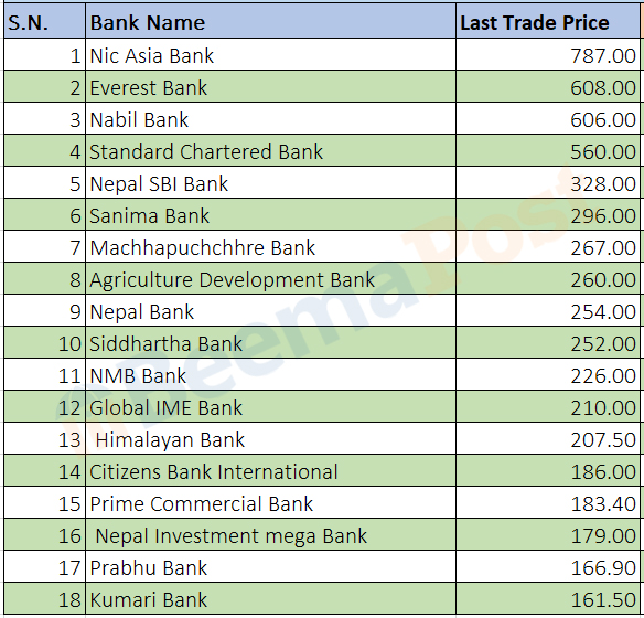 त्यस्तै, यो साता कारोबारको अन्तिम दिन स्टाण्डर्ड चार्टड बैंकको ५६० रुपैयाँ, नेपाल एसबिआई बैंकको ३२८ रुपैयाँ, सानिमा बैंकको २९६ रुपैयाँ, माछापुच्छे बैंकको २६७ रुपैयाँ, कृषि विकास बैंकको २६० रुपैयाँ, नेपाल बैंकको २५४ रुपैयाँमा शेयर कारोबार भएको छ ।