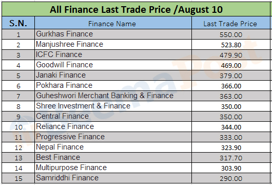 दोस्रो नम्बरमा रहेको मन्जुश्री फाइनान्सको कारोबार ५२३ रुपैयाँ र आइसीएफसी फाइनान्सको ४७९ रुपैयाँ तथा गूडविल फाइनान्सको ४६९ रुपैयाँमा शेयर कारोबार भएको पाएको छ । त्यस्तै, जानकी फाइनान्सको ३७९ रुपैयाँ, पोखरा फाइनान्सको ३६६ रुपैयाँ रहेको छ ।