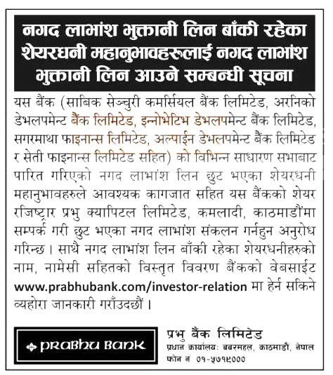 काठमाडौं । प्रभु बैंक लिमिटेडले नगद लाभांश भुक्तानी लिन बाँकी रहेका शेयरधनीलाई नगद लाभांश लिन आग्रह गरेको छ ।