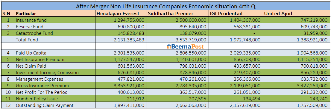 समीक्षा अवधिमा वित्तीय विवरण सार्वजनिक गरेका हिमालयन एभरेष्ट, सिद्धार्थ प्रिमियर, आईजिआई प्रुडेन्सियल र युनाइटेड अजोड इन्स्योरे मर्जर भई बनेका नयाँ कम्पनी हुन् ।