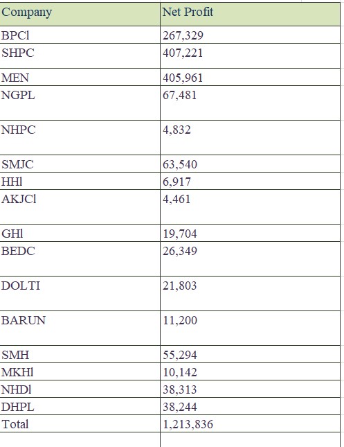 हाइड्रोपावरको चौथौ त्रैमासको वित्तिय विवरणः सानिमा माई मुनाफामा अगाडि, ६ वटा कम्पनीको खुद नाफा ऋणात्मक (सूची सहित )