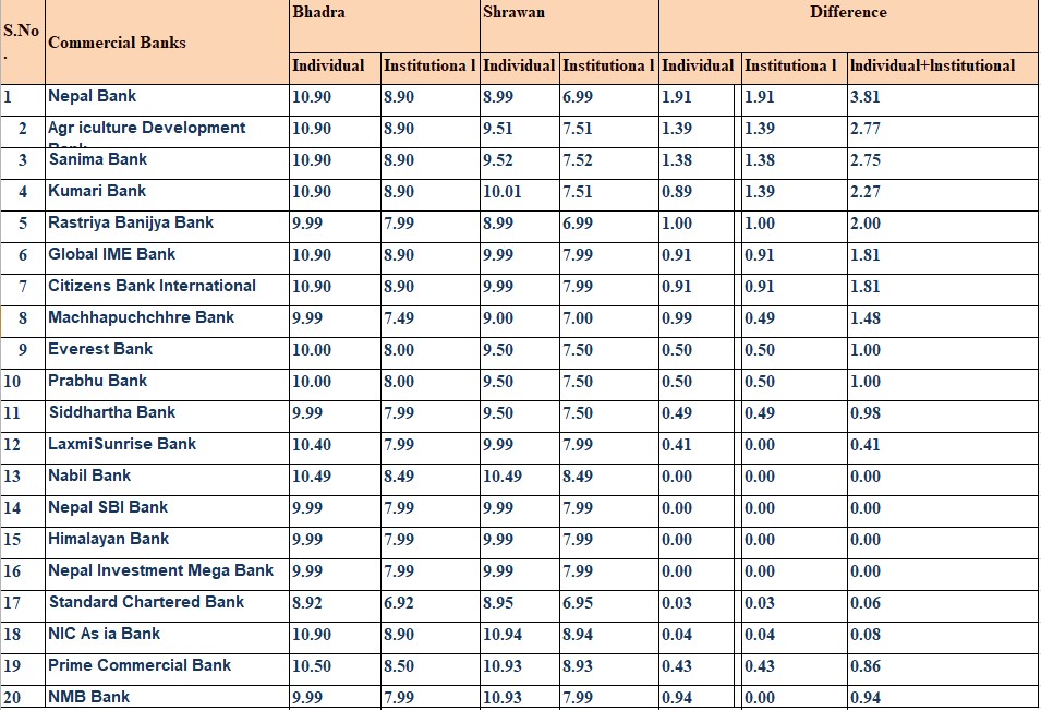 अधिकांस बैंकले भदौंमा ब्याजदर बढाउँदा ४ वटा बैंकले ब्याजदर घटाएका छन् । ब्याजदर घटाउनेमा एनएमबी बैंक, प्राइम बैंक, स्टाण्डर्ड चार्टड बैंक एनआइसी एसीया बैंक छन् ।भदौंमा नेपाल इन्भेष्टमेन्ट मेगा बैंक, नबिल बैंक, एसबीआइ बैंक, हिमालयन बैंकले ब्याजदर स्थीर राखेका छन् ।