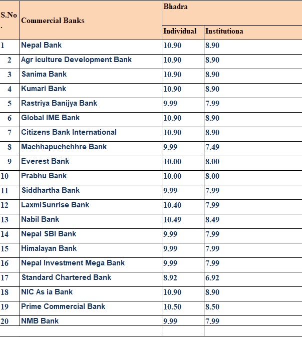 सोहीअनुसार वाणिज्य बैंकहरुले भदौका लागी नयाँ ब्याजदर निर्धारण गरेको छन् । कुन बैंकको ब्याजदर कति रुभदौका लागि ७ वाणिज्य बैंकले मुद्दति निक्षेपमा १०।८९६ प्रतिशत ब्याजदर दिने जनाएका छन् ।