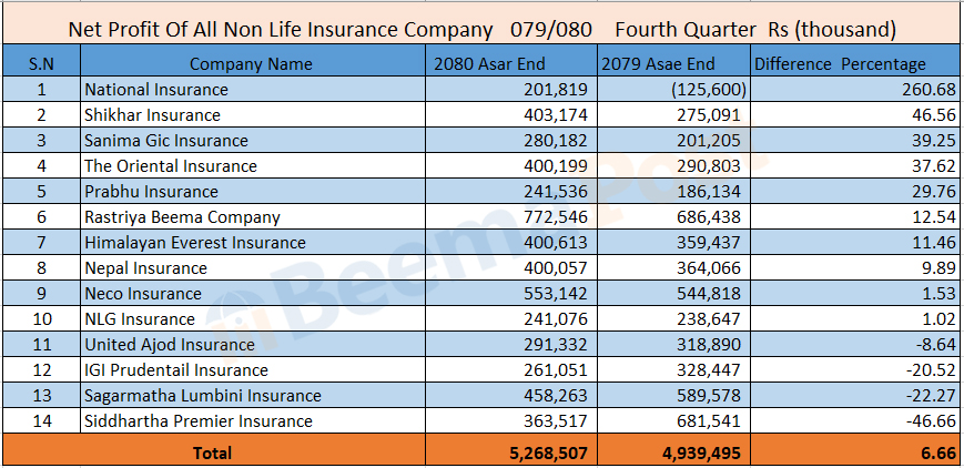 विवरण अनुसार समिक्षा अवधिमा शिखर, हिमालय एभरेष्ट, द ओरियन्टल र नेपाल इन्स्योरेन्सले ४० करोड रुपैयाँ, सिद्धार्थ प्रिमियर इन्स्योरेन्सले ३६ करोड रुपैयाँ, युनाइटेड अजोडले २९ करोड रुपैयाँ, सानिमा जिआइसीले २८ करोड रुपैयाँ खुद नाफा आर्जन गरेको छ ।