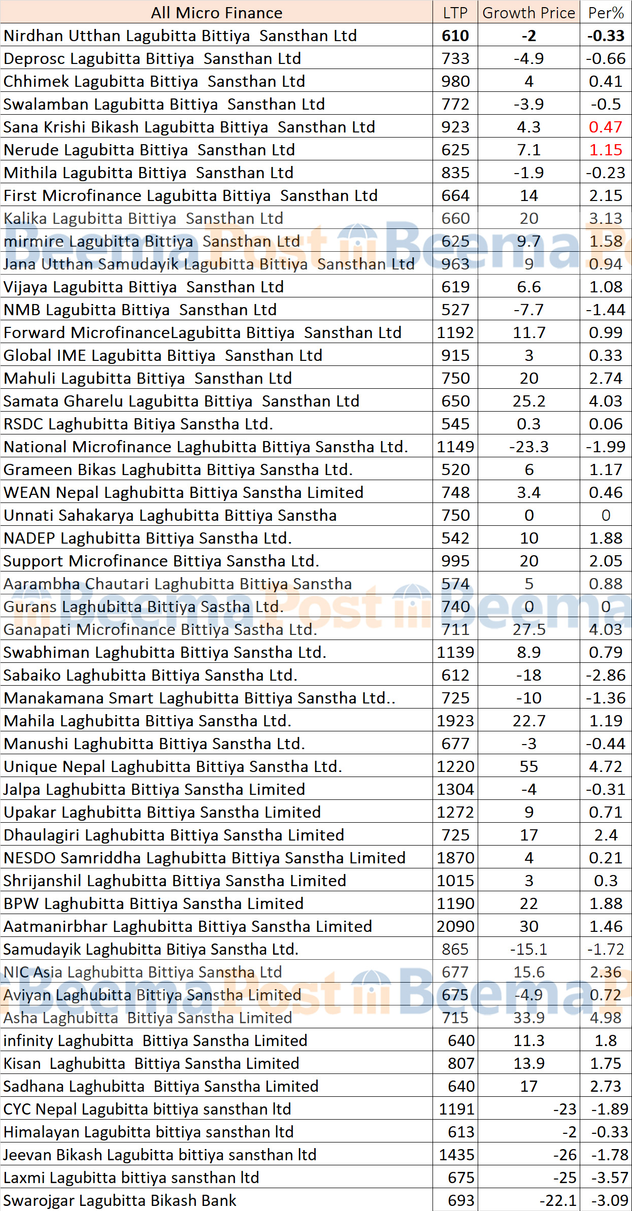काठमाडौं । साताको अन्तिम दिनमा सुधारको बाटो समाउदै ०।२८ अंकको वृद्धि भएको लघुवित्त वित्तिय संस्थाहरुको शेयर मूल्य अधिकांशको घटेको छ ।