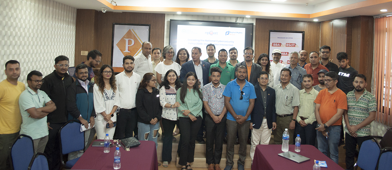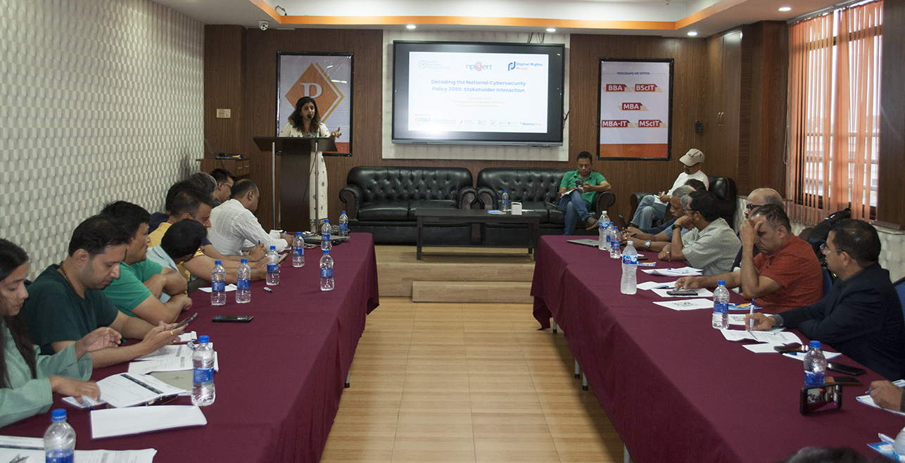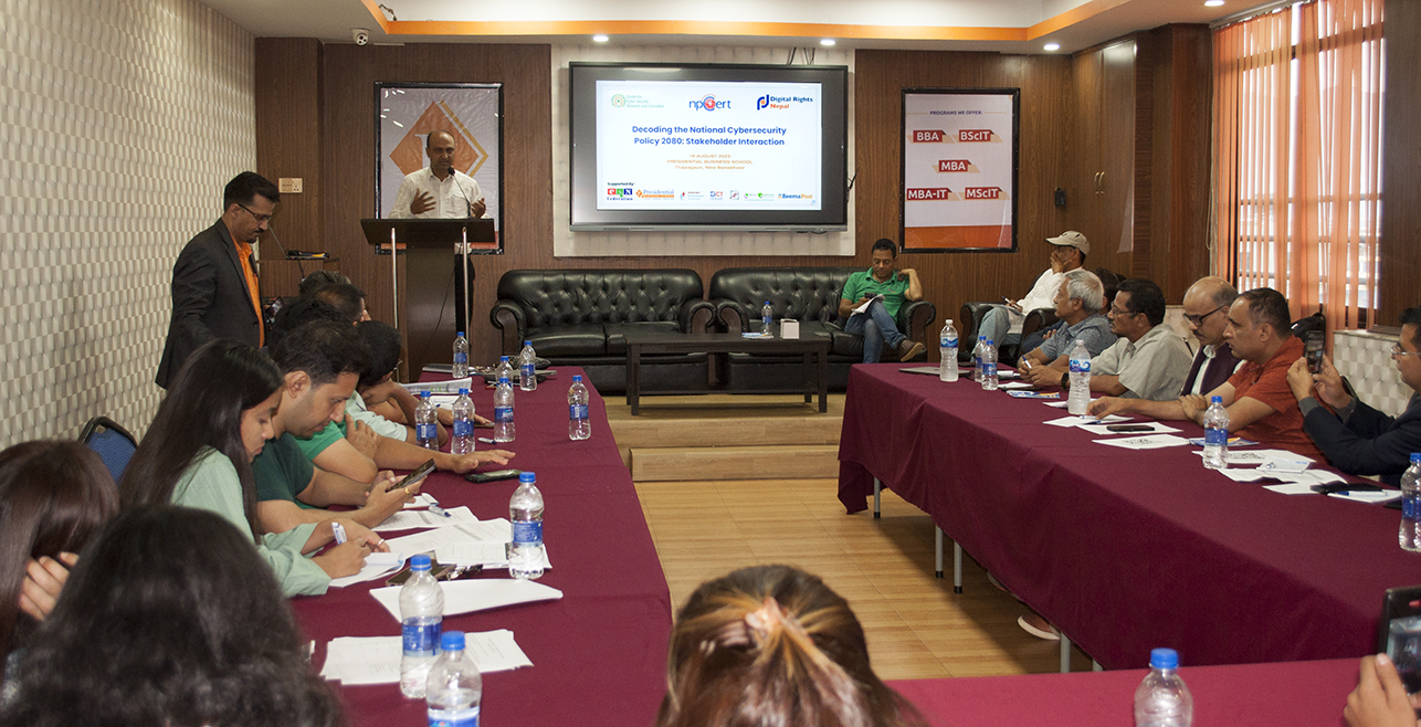 कार्यक्रममा केन्द्रिय साइवर सुरक्षा, सेन्टर फर साईबर सेक्युरिटी रिसर्च एण्ड इन्नोभेशन, एनपी सर्ट र डिजिटल राईट्सको संयुक्त आयोजना साईबर सुरक्षा नीतिमाथिका समस्या चुनौतिका विषयमा छलफल भएको हो ।