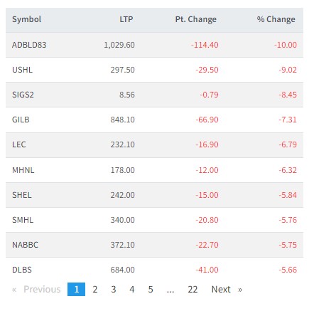 त्यस्तै, अपर स्याङ्गो, सिद्धार्थ इन्भेष्टमेन्ट ग्रोथ, ग्लोबल आइएमई लघुवित्त, लिवर्टी इनर्जी, माउन्टेन हाईड्रो, सिंगटी हाईड्रोपावर, सुपर मादी,नारयणी डेभलपमेन्ट बैंक र धौलागिरी लघुवित्तको शेयर मूल्य घटेको छ।