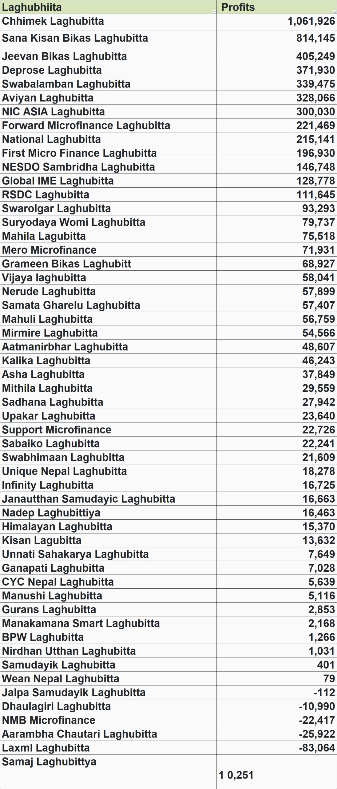 जालपा सामुदायिक लघुवित्त, धौलागिरी लघुवित्त, एनएमबी माईक्रोफाइनान्स, आरम्भ चौतारी लघुवित्त, लक्ष्मी लघुवित्तको मुनाफा भने ऋणात्मक रहेको छ ।
