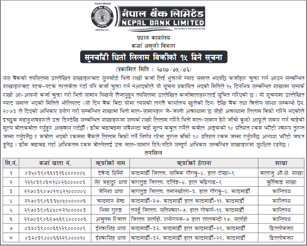 नेपाल बैंक लिमिटेडको उल्लेखित शाखाहरुमा सुनचाँदी धितो राखि कर्जा लिएको र म्याद समाप्त भैसकेपछि पनि कर्जा चुक्ता नगरेपछि बैंकले १५ दिनभित्र सम्बन्धित शाखामा सम्पर्क राखि कर्जा चुक्ता गरी धितो सामान लैजान आग्रह गरेको छ ।