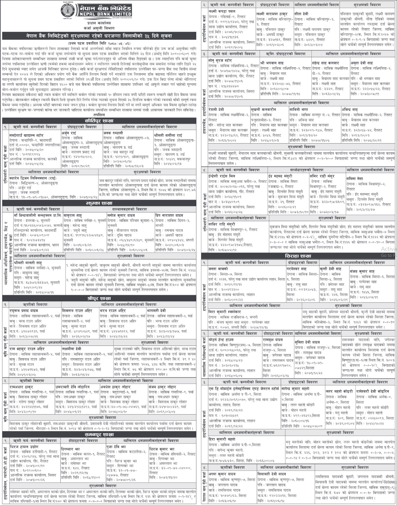 नेपाल बैंकले विभिन्न शाखामा धितोमा रहेको यी सम्पत्ति लिलाम मार्फत बिक्री गर्दै