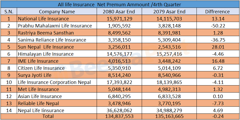 जीवन बीमा कम्पनीको खुद बीमा शुल्क आर्जन घट्यो, कुनको कति ? (तथ्यांकसहित)