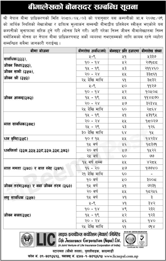 कम्पनीले सावधिक, जीवन विधा, जीवन साथी र जीवन श्री बीमा योजनामा न्युनतम ५१ रुपैयाँदेखि अधिकतम ६१ रुपैयाँसम्म बोनसदर घोषणा गरेको छ । सो बीमालेखहरुमा ५ वर्षदेखि २५ वर्षसम्मको अवधि रहेको छ ।