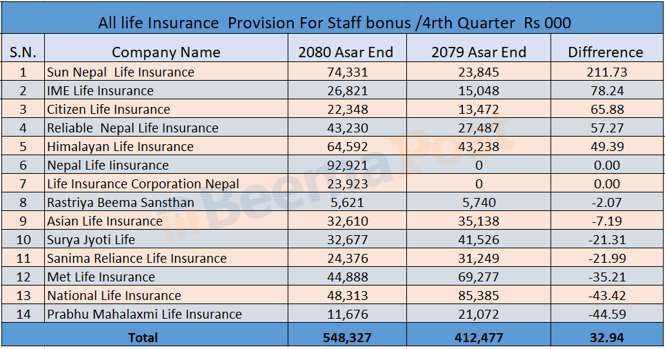 जीवन बीमा कम्पनीहरुको कर्मचारीे बोनस ३३ प्रतिशतले बढ्यो, सात कम्पनीले घटाए, कुनको कति ? (तथ्यांकसहित)