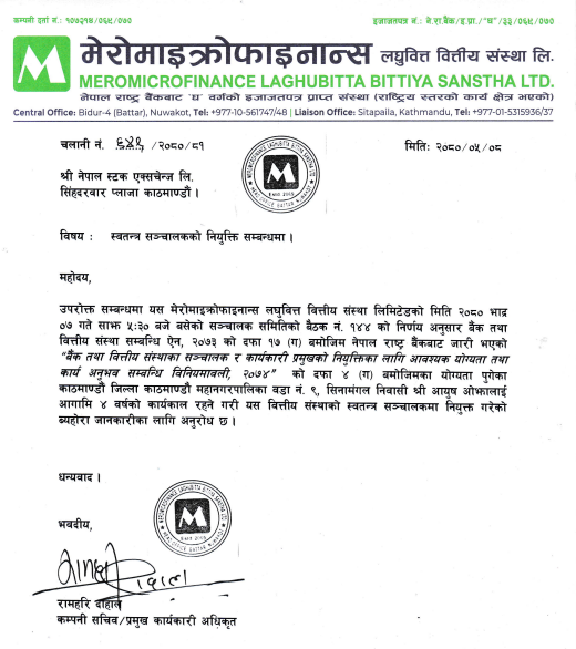संस्थाको भदौ ७ गते बसेको सञ्चालक समितिको बैठकले काठमाण्डौ महानगरपालिका ९, सिनामंगल निवासी ओझालाई आगामि ४ वर्षको कार्यकाल रहने गरी स्वतन्त्र सञ्चालकमा नियुक्त गर्ने निर्णय गरेको हो ।