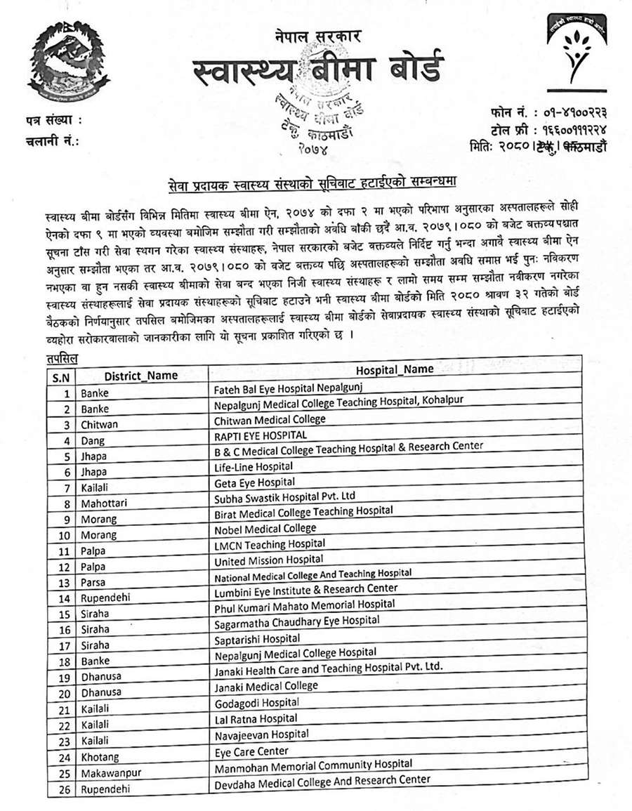 नेपाल सरकारको बजेट निर्दिष्ट गर्नु भन्दा अगावै स्वास्थ्य बीमा ऐन अनुसार सम्झौता भएका तर २०७९।०८० को बजेट वक्तव्य पछि अस्पताहरुको सम्झौता अवधि समाप्त भई पुनः नविकरण नभएका वा हुन नसकी स्वास्थ्य बीमाको सेवा बन्द भएका निजी स्वास्थ्य संस्थाहरु र लामो समयसम्म सम्झौता नविकरण नगरेका स्वास्थ्य संस्थाहरुलाई सेवा प्रदायक संस्थाको सूचीबाट हटाएको बोडले जनाएको छ ।