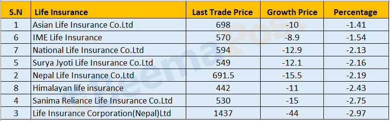 यो साता शेयर बजारमा ८ कम्पनीको शेयर कारोबार भएको छ । यो साता शेयर कारोबार भएका आठ जीवन बीमा कम्पनीहरुमध्ये सबै कम्पनीको शेयरमूल्य घटेको छ ।