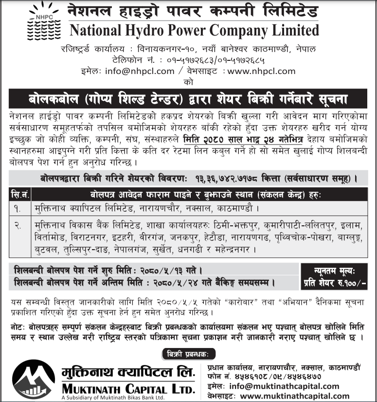 शेयर लिलाम तथा बिक्री प्रबन्धकमा मुक्तिनाथ क्यापिटल रहेको छ भने लिलामीको शेयरमा भदौ २४ गतेसम्म आवेदन दिन सकिने छ ।