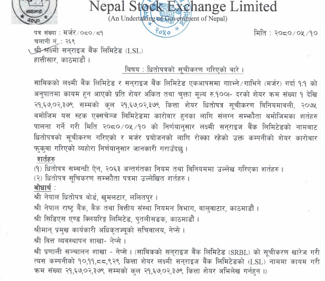 तत्कालीन लक्ष्मी र सनराइज बैंक एक आपसमा मर्ज भएपश्चात यो सेयर लक्ष्मी सनराइज बैंकको नाममा सूचीकृत भएको हो ।