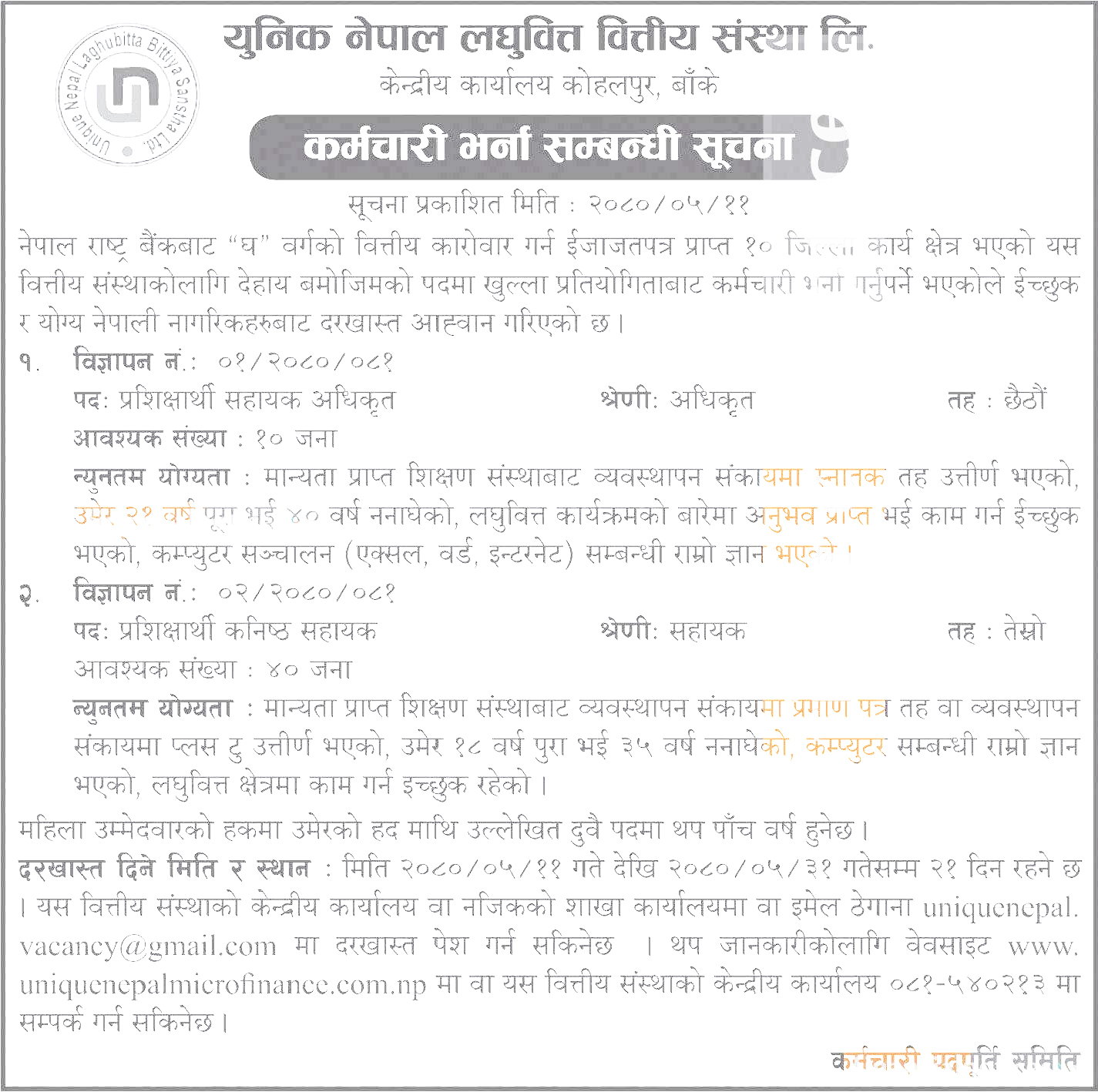 युनिक नेपाल लघुवित्तमा ठूलोमात्रामा रोजगारीको अवसर, दिने हैन त आवेदन